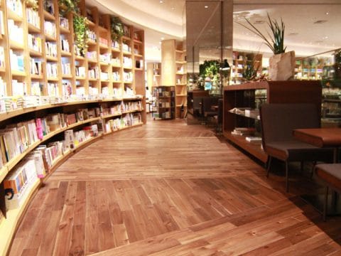 例えば、二子玉川ライズ蔦屋書店様では、アカシア乱尺(特注品)ワイルド無垢フローリングを施工していただいています。※特注品になりますが、オーダーいただきましたら生産可能です。ビンテージ感のある艶消しのウォールナット植物オイルで仕上げられて、一日中本を選んでいたくなるような落ち着いた空間に仕上げられています。