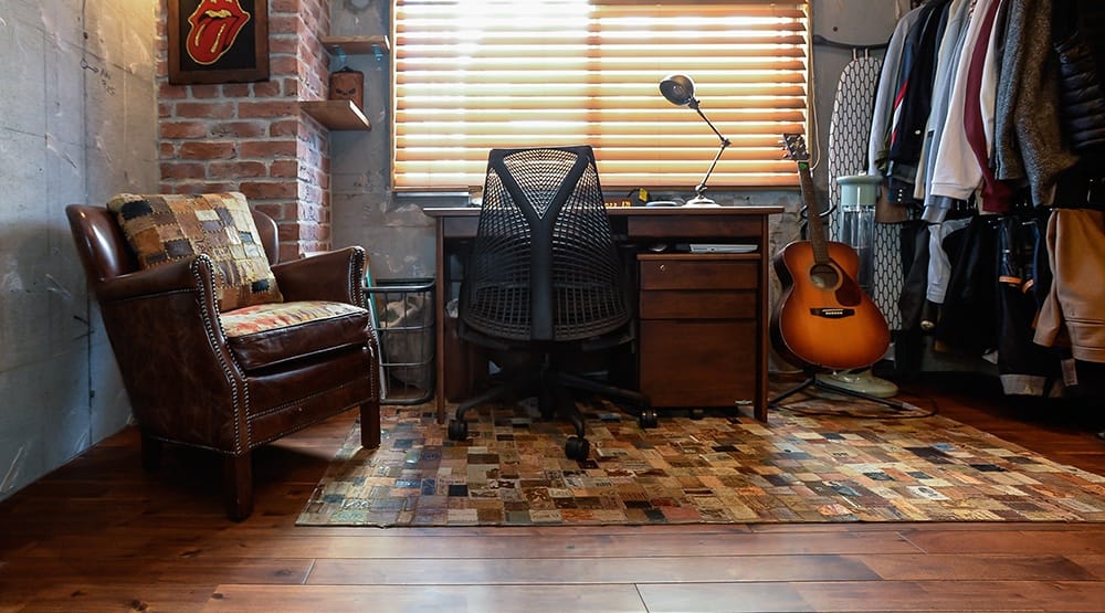 愛猫と暮らす、お客様の「好き」が詰まったこだわりの住宅。その書斎スペースに、アカシアのウォールナット着色塗装品をご採用いただきました。節や白太が多く色味の幅が大きいアカシア材に、濃いめのブラウンで着色塗装を施すことで、素材感を活かしつつ落ち着いた表情に仕上げたフローリングです。アカシアらしいラフな雰囲気を残しながら、優しい木目と着色塗装によりウォールナット的な品の良さも感じさせるため、コンクリート打ちっ放しの壁やレンガ、スチールや皮革といった異素材の組み合わせにもよく馴染む、絶妙なバランス感が魅力です。