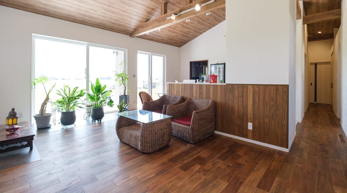 こちらの床材は、アンティーク風にダメージ加工を施し、ウォールナット風の着色塗装で仕上げたもの。白太は着色塗装で目立ちにくくなっていますが、自然な色幅や節によって適度な素材感が残っており、西海岸風やアジアンテイスト、インダストリアル、古民家の改修、店舗、モダンな一般住宅など様々な物件に採用されています。凹凸感のある独特の足触りも心地良い、大人の遊び心をくすぐるフローリングです。
