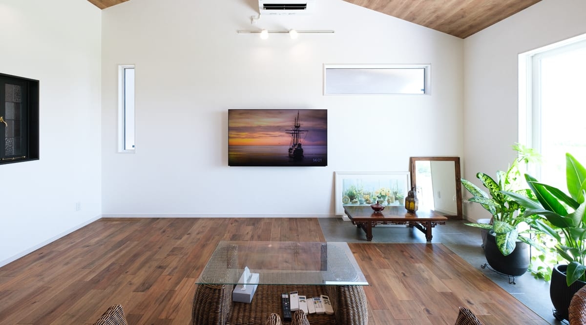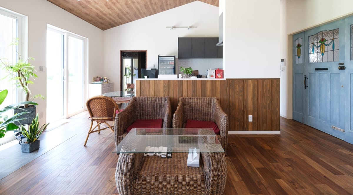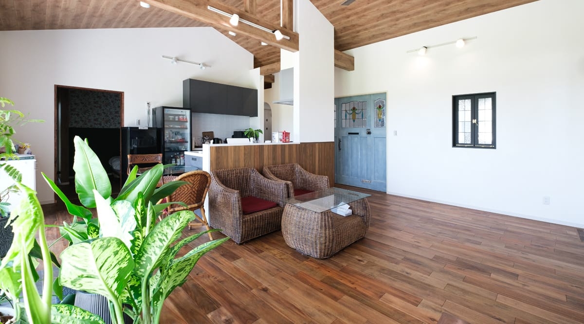 こちらのお施主様は、「アカシアが見たい」と大阪ショールームにご来店。高い天井、大きな梁、腰壁、建具や家具など、イメージされていたインテリアとの相性から、ウォールナット風に着色塗装をしたアンティーク加工品をお選びになりました。コロニアル風のインテリアに、適度な素材感と古材風の風合いを備えたフローリングが非常によくマッチしています。
