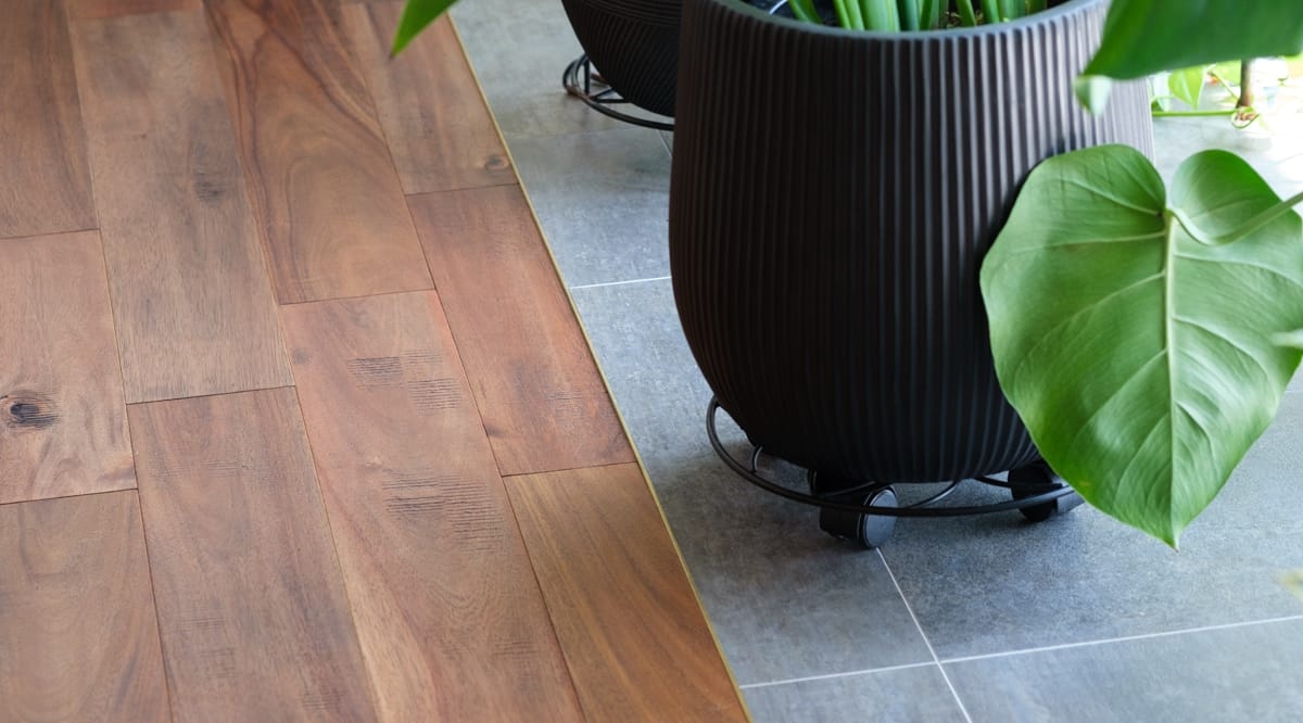 近年すっかり身近な木材になったアカシア材は、生育が早く供給が比較的安定しており、適度な硬さや耐久性もあることから、お求めやすく居心地の良い床材として高い人気を誇っています。産地による個性(色味や比重、木肌の質感など)の違い、同じ産地でも原木ごとに異なる色味に加え、小径木が多く節や白太が多いことなどから「主張の強い材」という印象がありますが、木目はオークや杉などと違って控えめなため、濃色で着色することでウォールナット風の落ち着いた雰囲気を演出することも可能です。