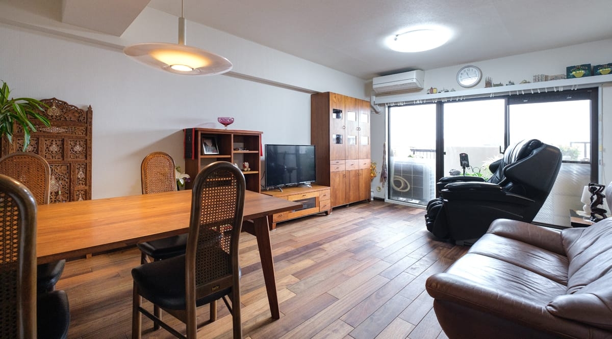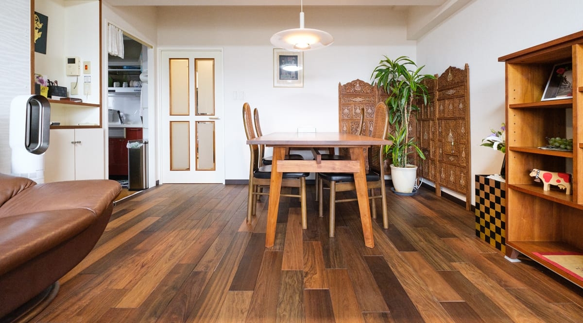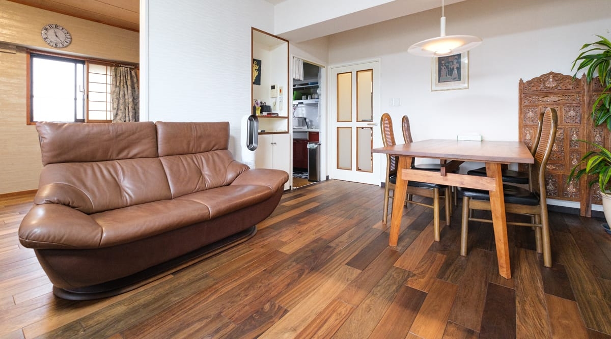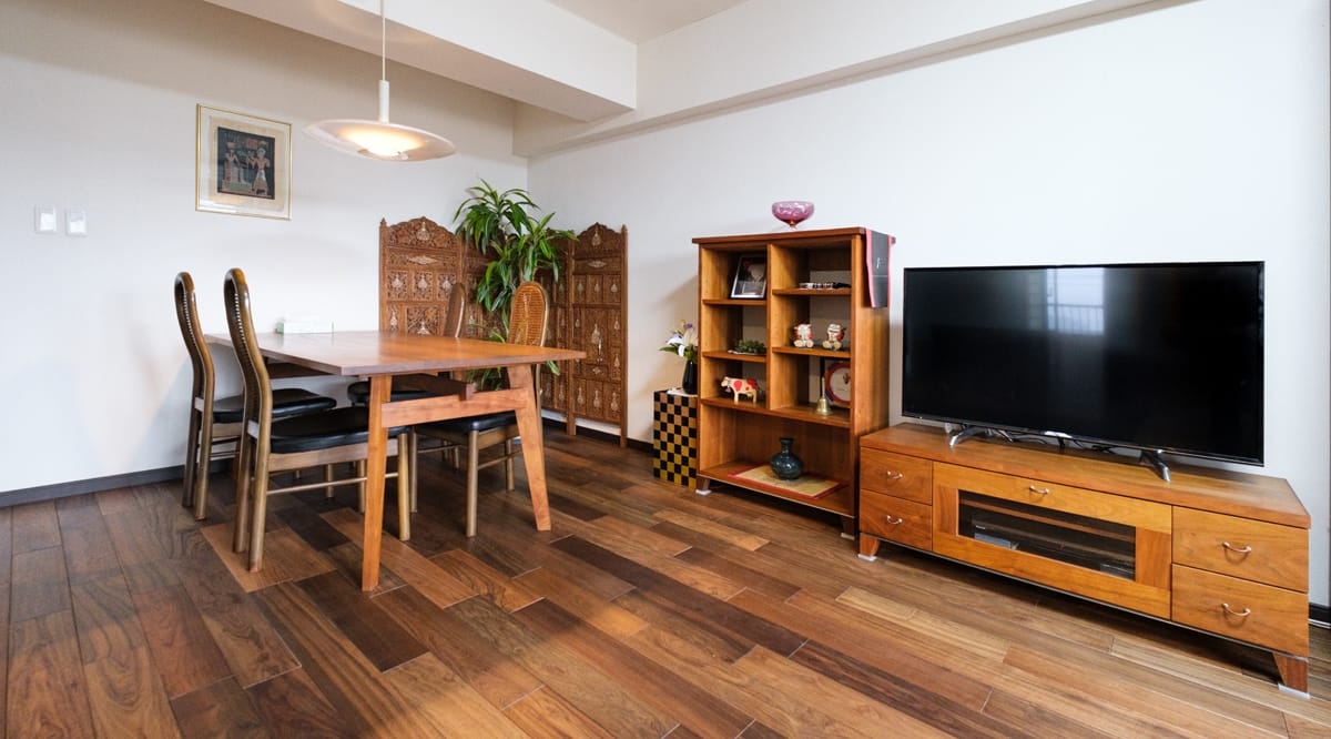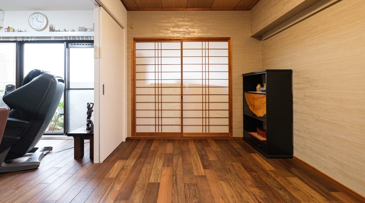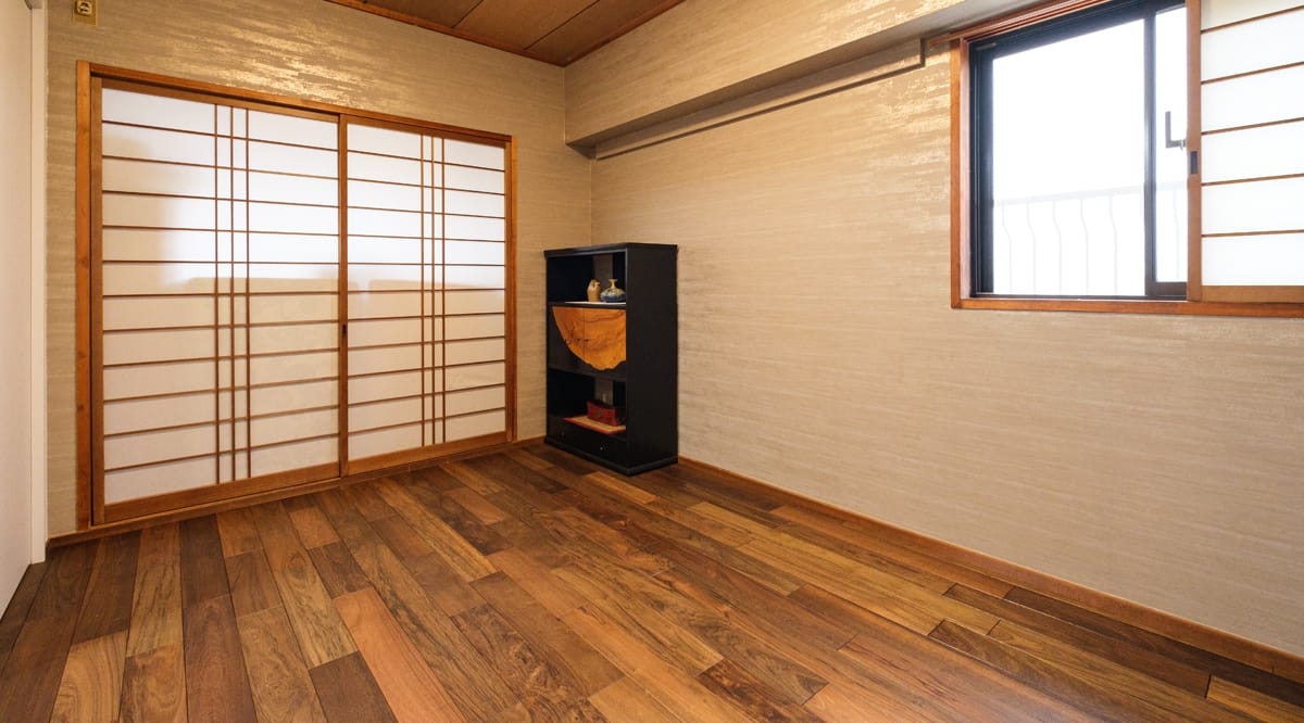 20年前にリフォームしたお住まいを、老後も快適に過ごせるように...と改めてリノベーションを検討されていたお施主様。特にご主人は木がお好きで、「ウォールナットか本花梨かアジアンウォールナットを!」と明確なイメージをお持ちでした。リノベーションに際し、床材に合わせた木製の家具を海外から取り寄せるほどのこだわりようで、アジアンウォールナットの足触りの良さもお部屋全体の仕上がりにもたいへん満足している、と喜んでいただけました。ゆくゆくはベッドを置くことも想定して、和室もアジアンウォールナットで統一されています。