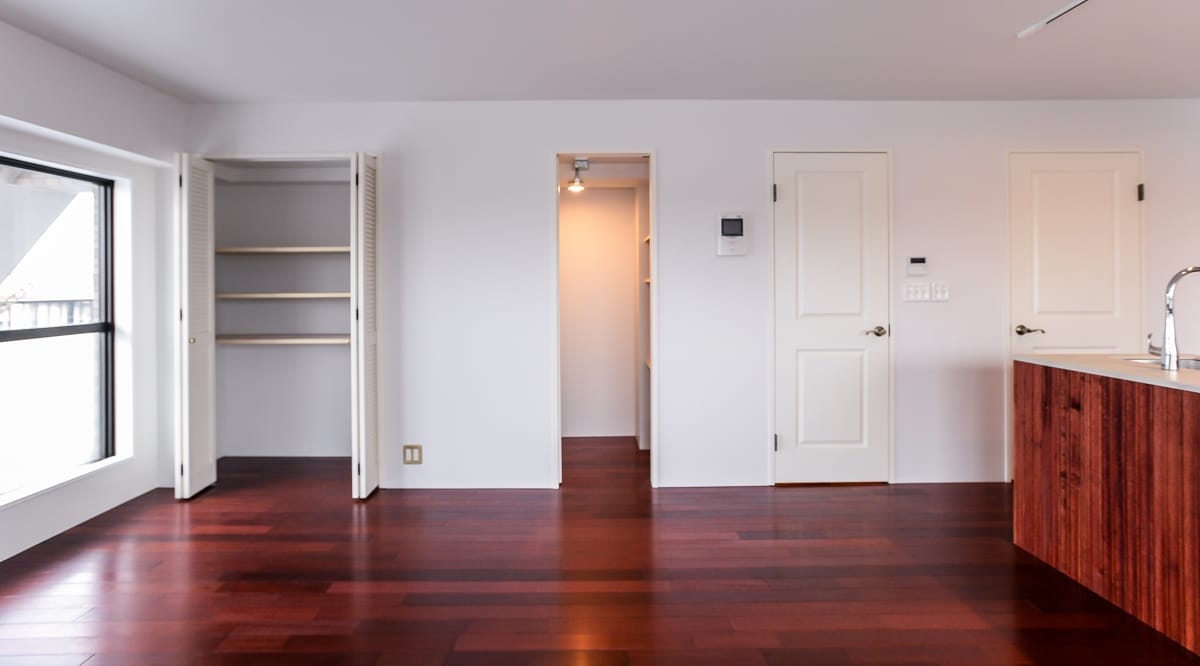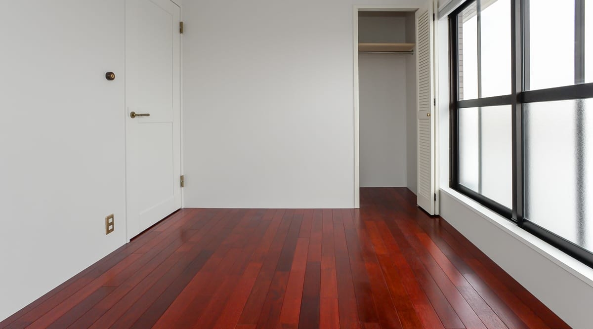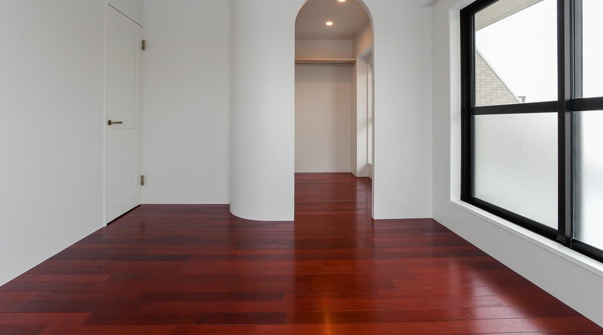 『太平洋鉄木』の別名もある通り、非常に重硬で耐久性に優れたメルバウは、優れた寸法安定性に加え、独特の赤味のある色合いと、南洋材らしい素朴な風合いの木肌が特徴。その赤みを活かし、無垢フローリングドットコムでは少し赤みを加えた調色ウレタン塗装を施すことで、華やかな印象を加えたものをご提案しています。メルバウの控えめな木目との組み合わせによって、華やかでありつつ主張しすぎない、落ち着いた雰囲気のお部屋に仕上がります。