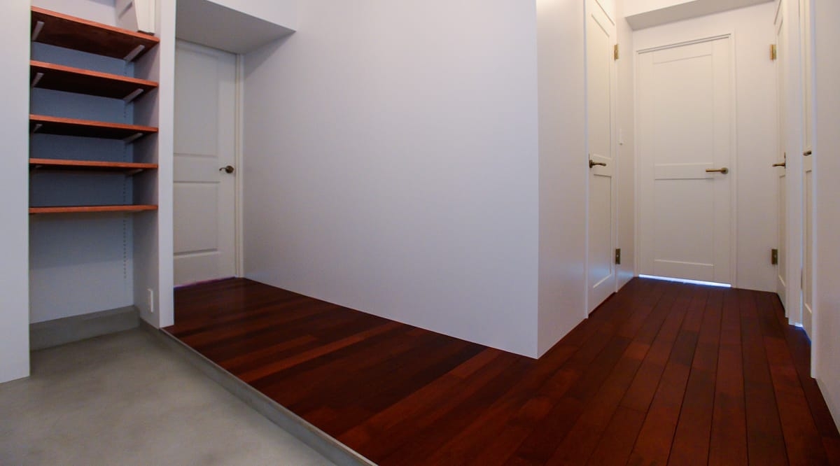 こちらの物件では、お施主様のイメージに合わせ、その標準の調色ウレタン塗装品(ST1UK)を基に色味を調整したものをご用意。キッチンのリブ材も塗装屋さんが床材の色味をベースに色合わせをして仕上げるなど、広い面積を占める床材はお部屋の空間づくりに大きく影響するだけに、床の仕上がりには非常に満足していただけました。