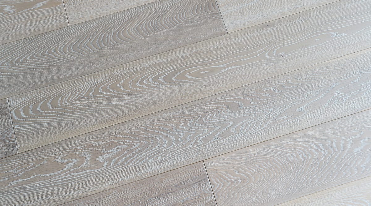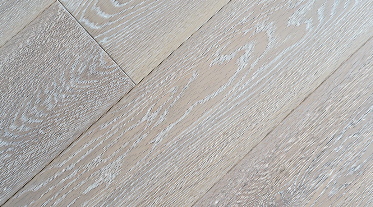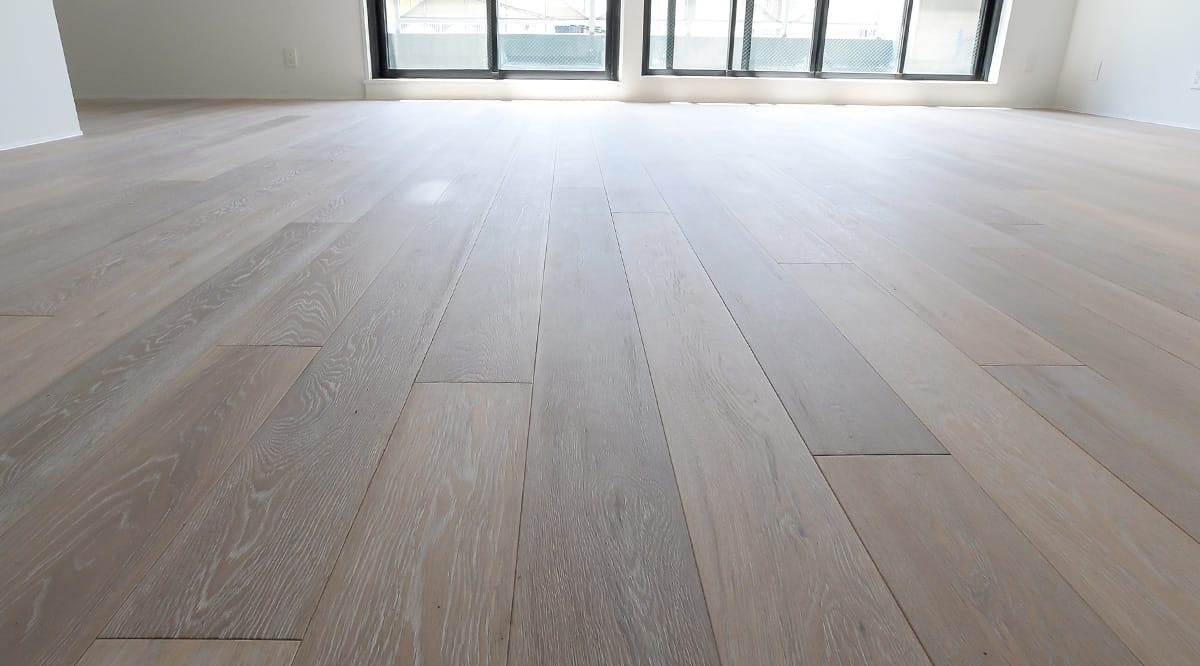 浮造りが映える木か否か(主に環孔材か散孔材か)、着色塗装が映える木か否かといったところで、どんな樹種にでも有効という仕上げではありませんが、オークとは非常に相性が良く、特にこうした節の少ない長尺の一枚ものですと、素地の色味とあいまって北欧風やモダンなインテリアとの相性は抜群です(透明の塗料で塗装をすると黄色味が強く出てきますが、無塗装の状態ではホワイト~グレーがかった彩度の低い色合いです)。