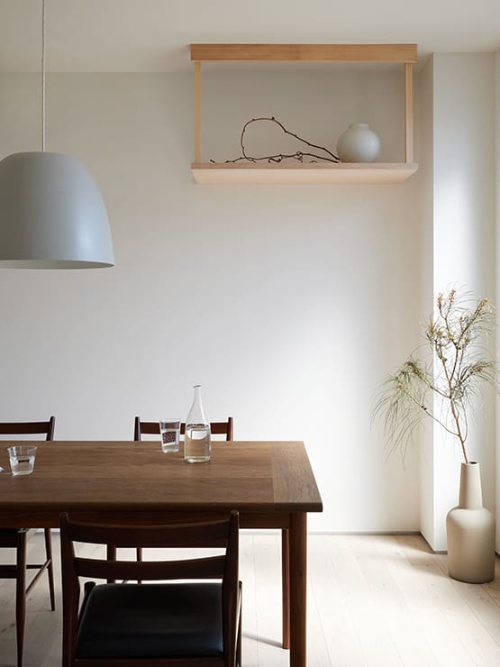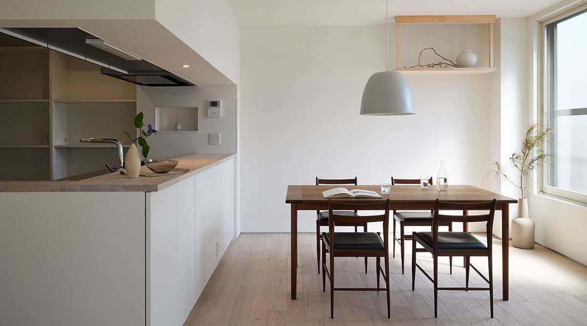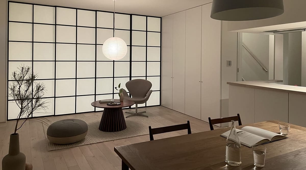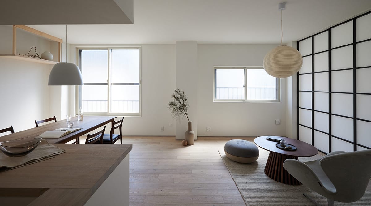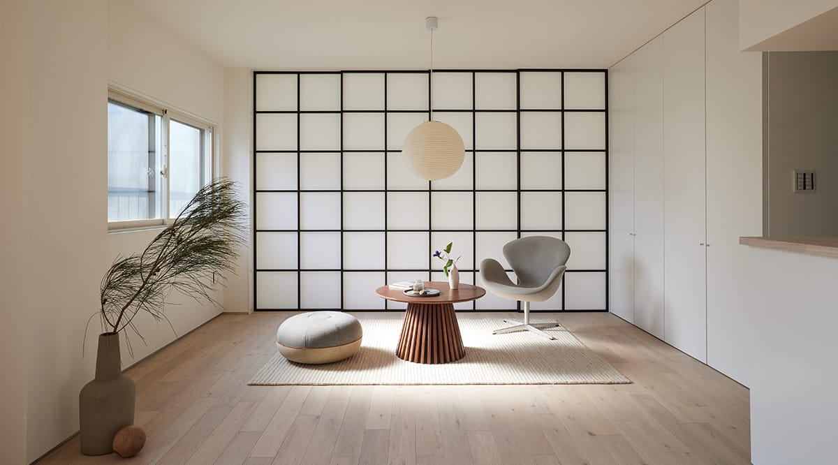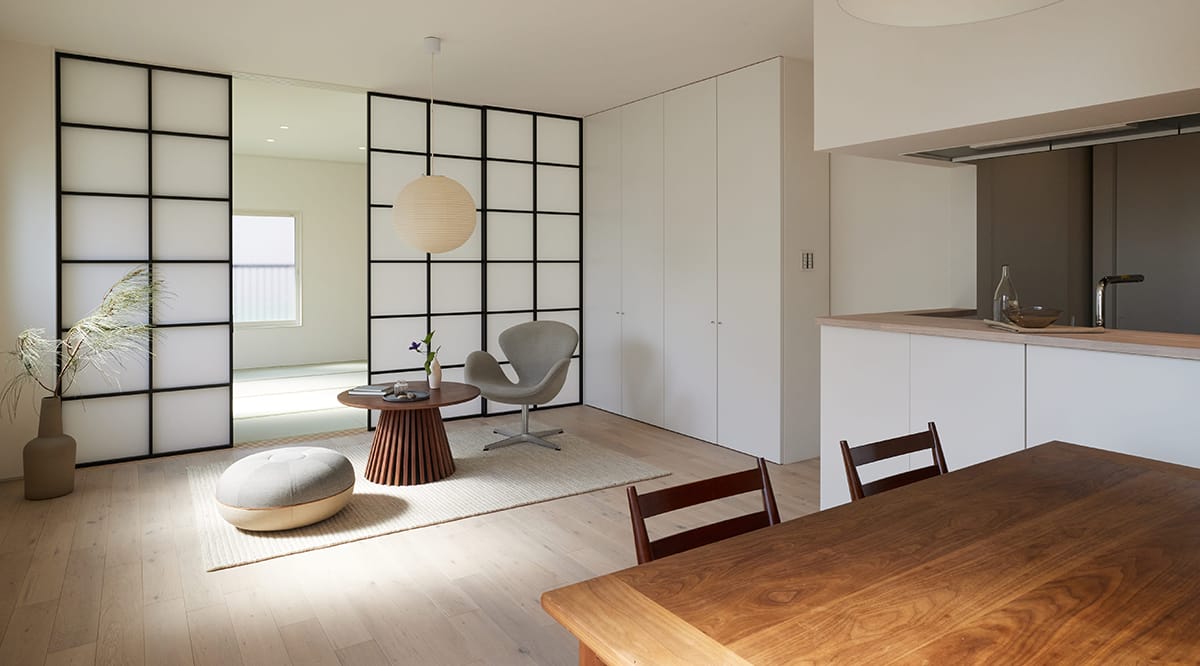 こちらのお部屋では、モノトーンでまとめたモダンなインテリアの中に障子戸や照明、神棚といった『和』の要素を配し、穏やかで静謐な空間にまとめあげています。障子や木のフローリングが反射する光はやわらかく、刻々と移ろう陰翳のゆらめきが美しい、住む人の感性にそっと触れてくる趣のあるお住まいです。