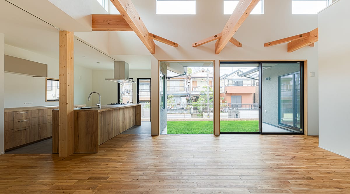 こちらは、天井高と高窓で開放感と採光を存分に確保した、平屋の一戸建て。壁やキッチン、建具などは「きれい」な素材とトーンでまとめ、その中に自然素材の力強さやあたたかみ、心地良い「ゆらぎ」を感じさせる大きな梁や柱、床材などが配された、落ち着いてくつろげる素敵なお住まいになっています。