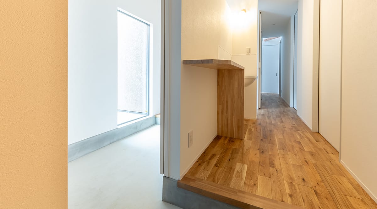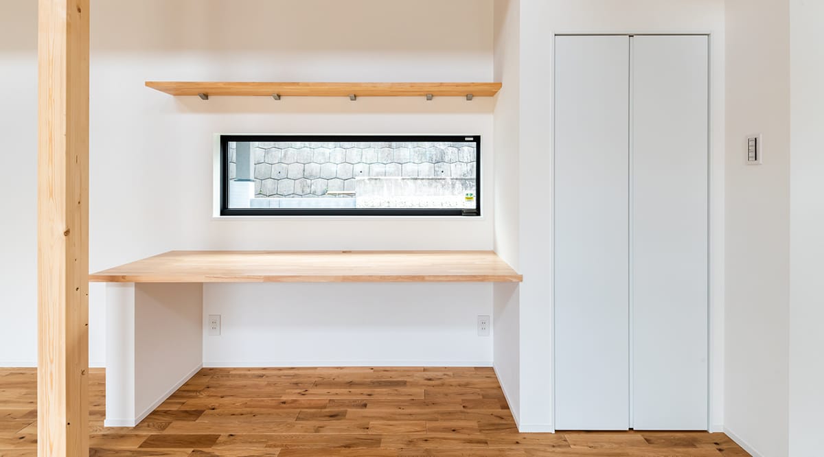 床材は、節や白太が多く含まれる『ワイルド」グレード。お施主様には複合フローリングという選択肢もありましたが、「無垢材を使った家に住んでみたい!」という当初からのご希望にまっすぐ、こちらの床材にお決めになりました。「まさに無垢材」という豊かな表情が特徴的なオークのワイルドグレード、味わいを増していく経年変化も愉しみな、日々の暮らしに末永く寄り添ってくれるフローリングです。