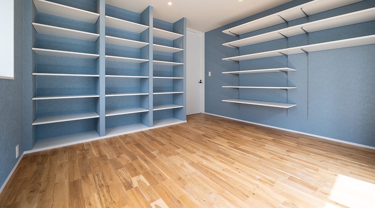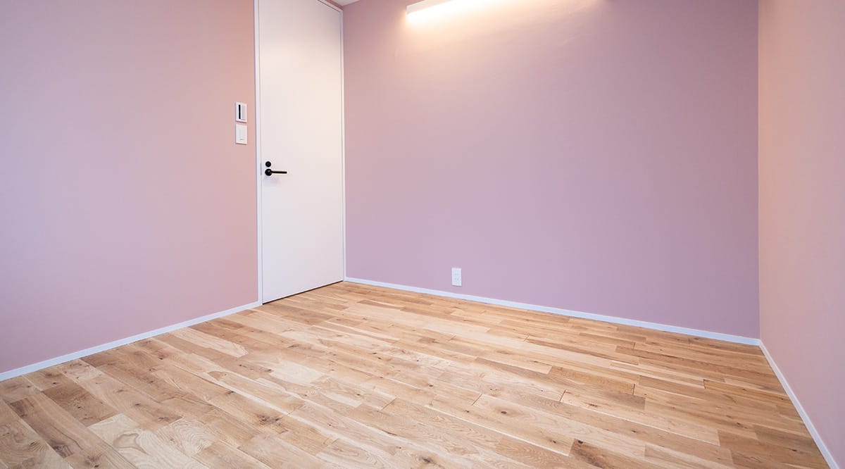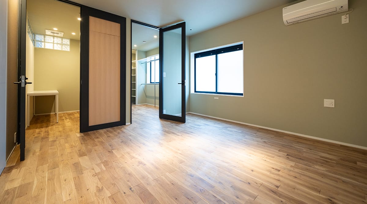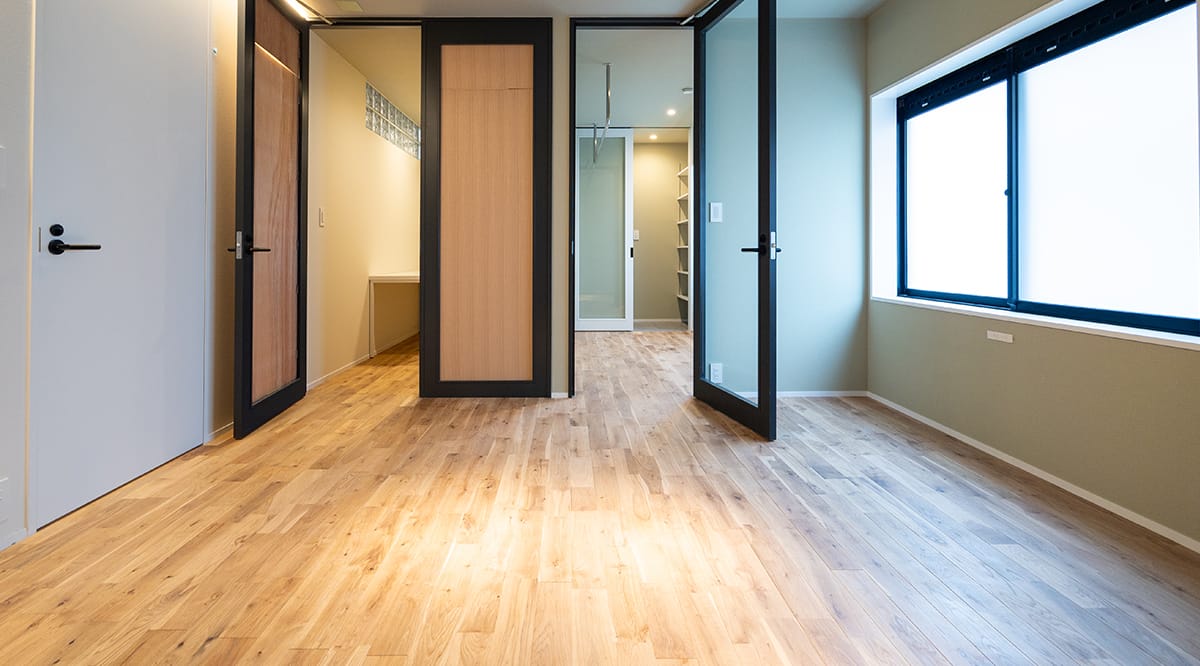 こちらのフローリングを使用されたのは、書斎とゲストルーム。表情が様々で面白味のある材を...ということでしたが、どんな壁紙や家具とでも合わせやすいオーク材だけに、同じ床材で統一感がありつつもお部屋ごとに表情が異なり、ごく自然に雰囲気が切り替わるのが楽しいところです。節や白太が多いワイルドグレードが、あたたかみや親しみやすさを感じさせてくれます。