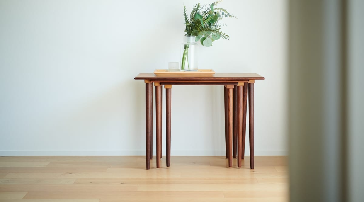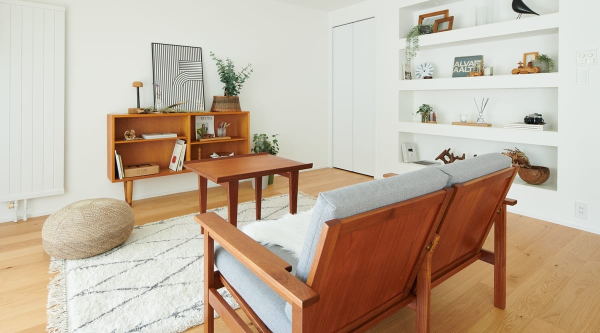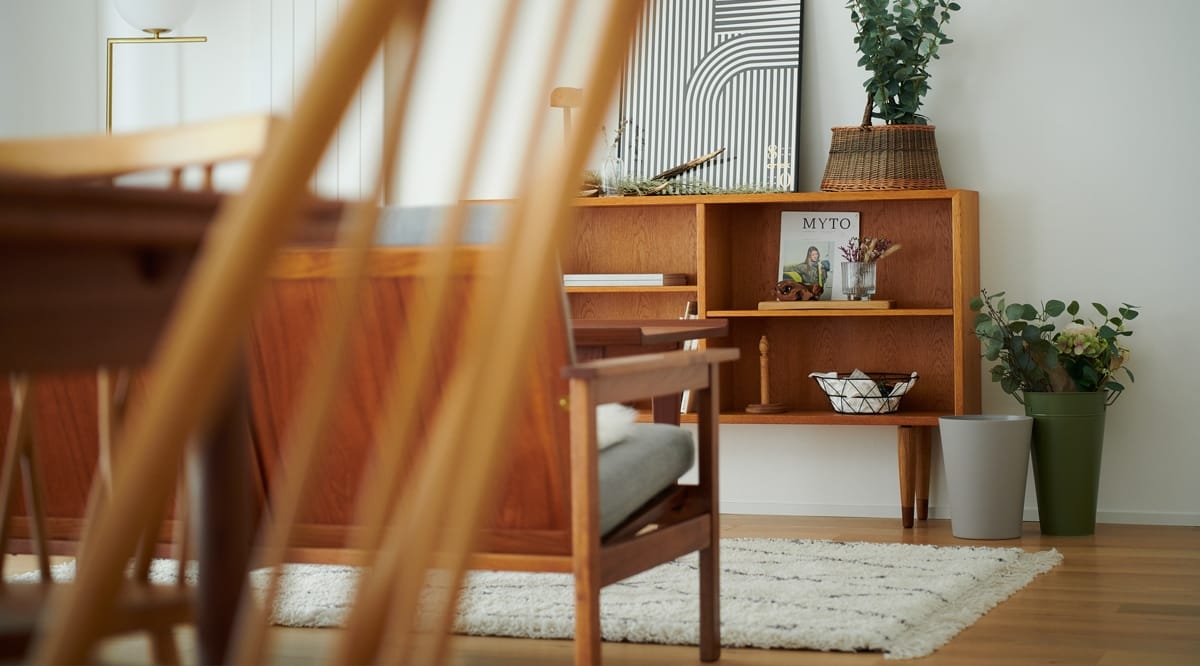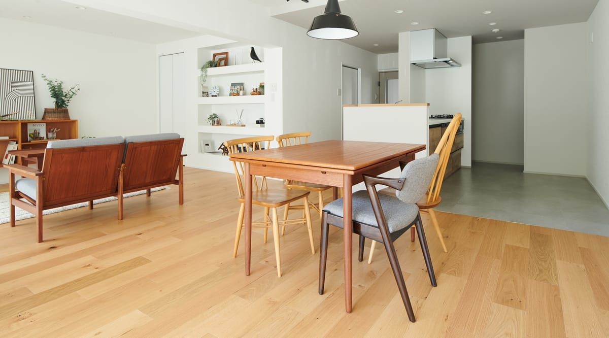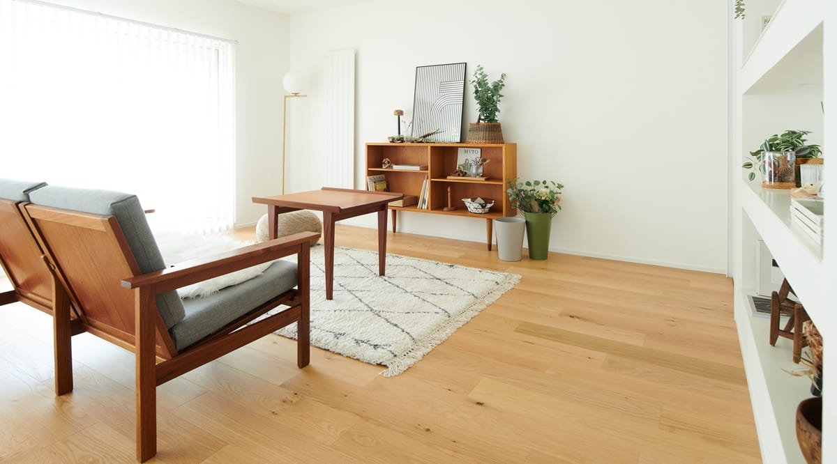 こちらは、節(パテ埋めを含む)が多く入るワイルドグレードのオーク材。壁や家具・建具の色味を選ばず、異素材との組み合わせでも引き立てあってくれるオーク材は、節の多寡や着色のアレンジなどで様々な表情を見せる、馴染み深い床材です。ワイルドグレードのオークは「木材らしい」と言われる明瞭な木目と素材感あふれる表情が特徴で、節の少ないナチュラルグレードに比べると主張が強めな床になります。綺麗に整ったインテリアのなかで、自然素材ならではの風合いや存在感をしっかりと出したい方、遊び心のある雰囲気にしたい方にお勧めです。