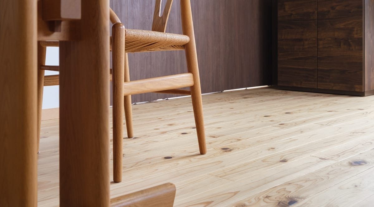 こちらは、九州や四国で産出された杉を使用した、節の多い『通常品』のフローリング。丸太の赤身部分と白身部分が混在する『源平』という仕様です。当初はこの源平の色差が目立ちますが、経年により色味が濃くなるにつれ、色味に統一感が出てきて落ち着いた表情にまとまっていきます。力強い木目ながら、どこか懐かしさを感じる、素朴でやさしい風合いが魅力です。