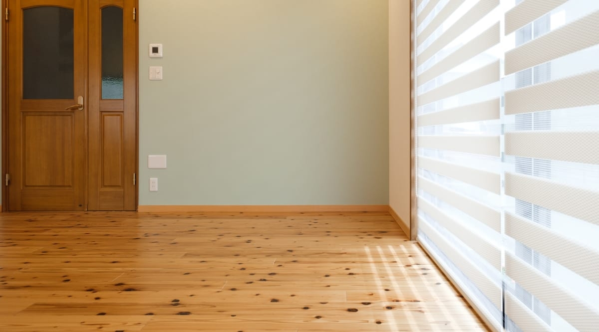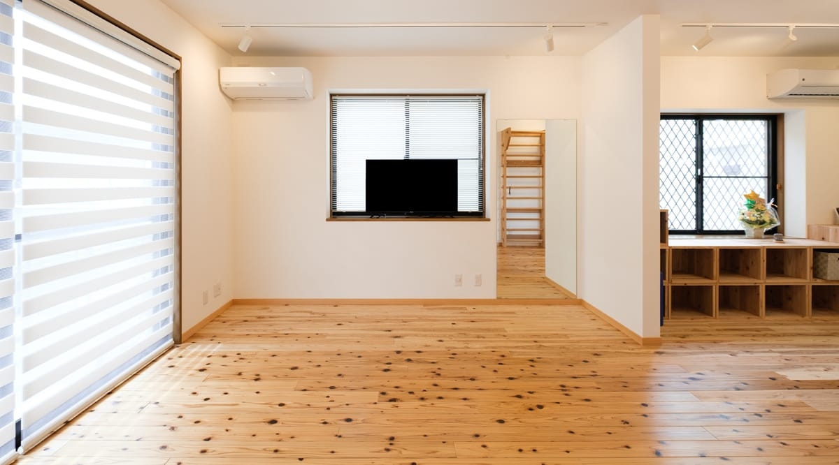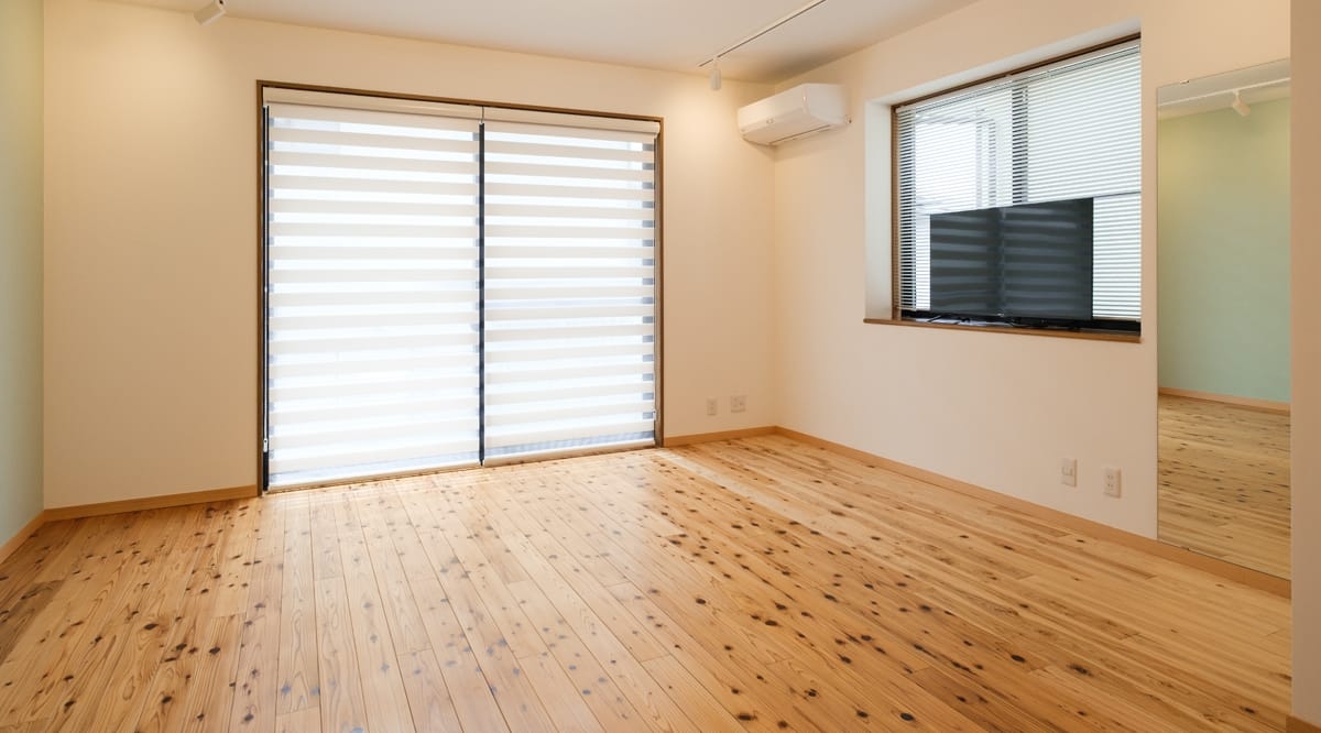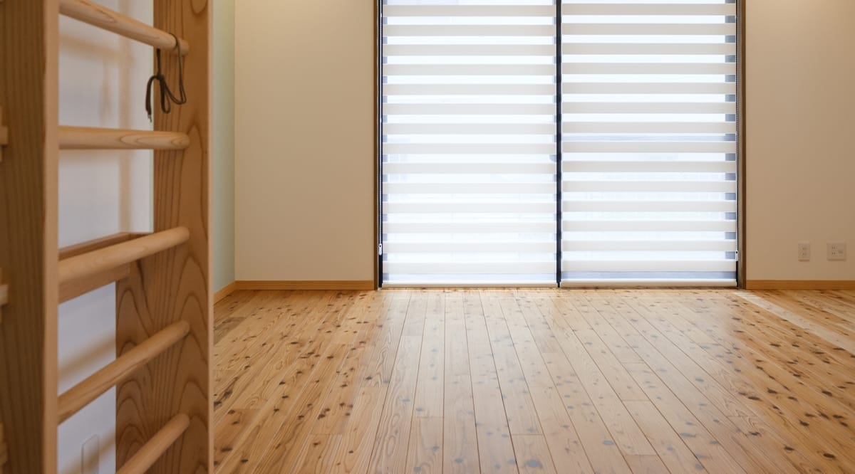※ こちらのお写真では、掃き出し窓に向かって左右の壁際は、通常の国産杉フローリングが貼られているようですので、両者の表情の違いがよくわかります。